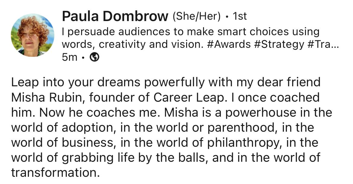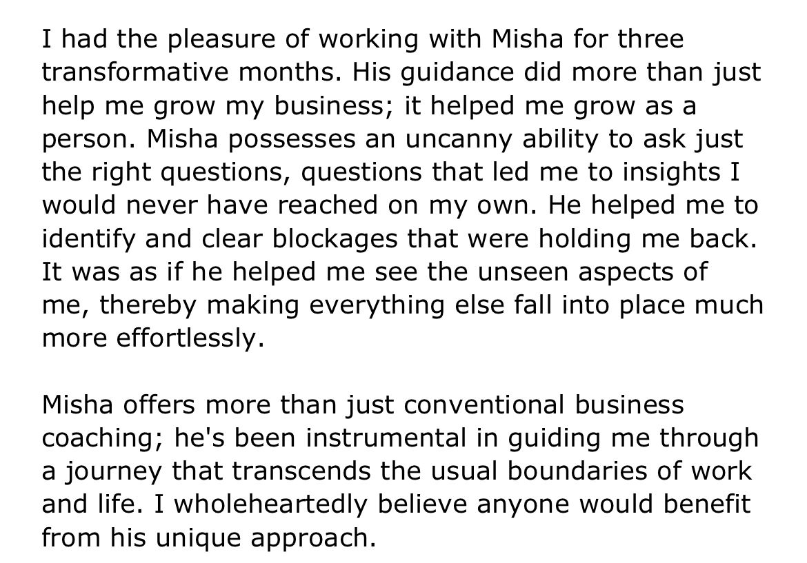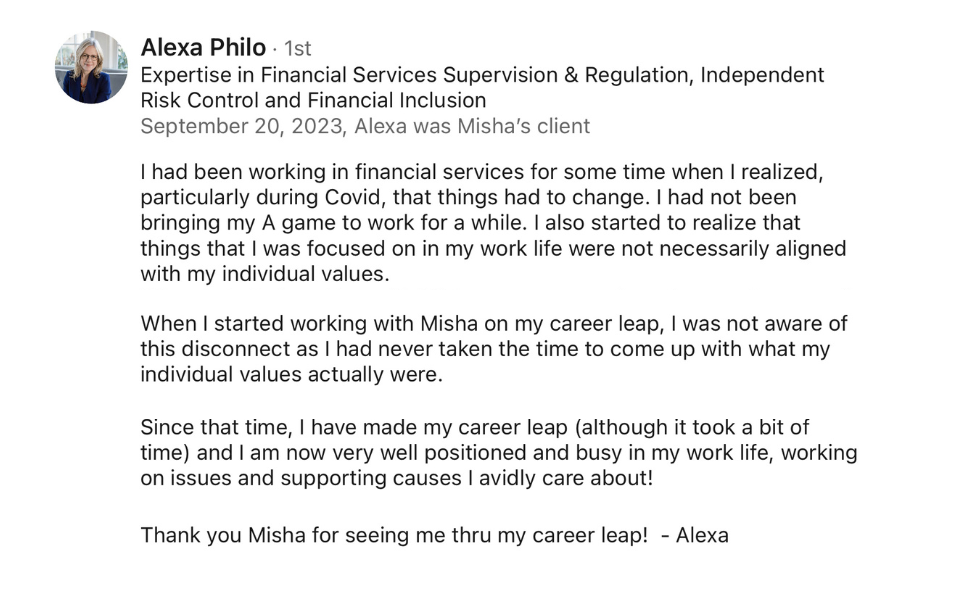 A few months of a carefully thought out and rigorous curriculum of course-work, working with Misha, I find myself suddenly excited with my career prospects ahead! He helped my identify my career values, what makes me tick, understand my strengths and be able to present myself in a way that I am truly passionate about, with evidence to back it all. I’m clear and confident about the next steps in my career - something I have not felt in a long time!